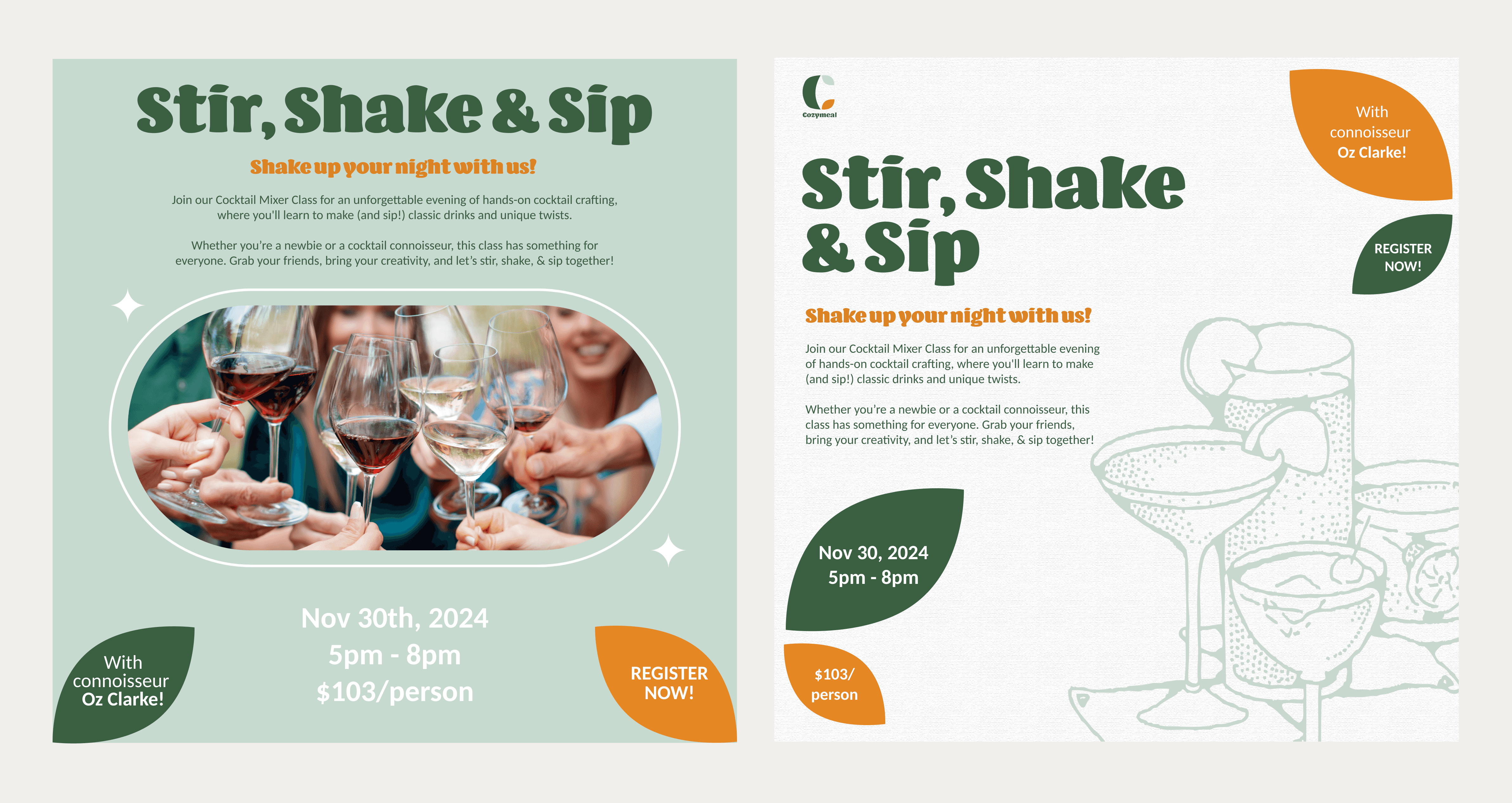 Cozymeal's branding in these social media posts was designed with the goal of emphasizing a cozy, hands-on, and immersive experience for food and drink enthusiasts. The mix of real-life imagery and illustrations caters to different audience preferences while maintaining a consistent color palette and inviting tone.