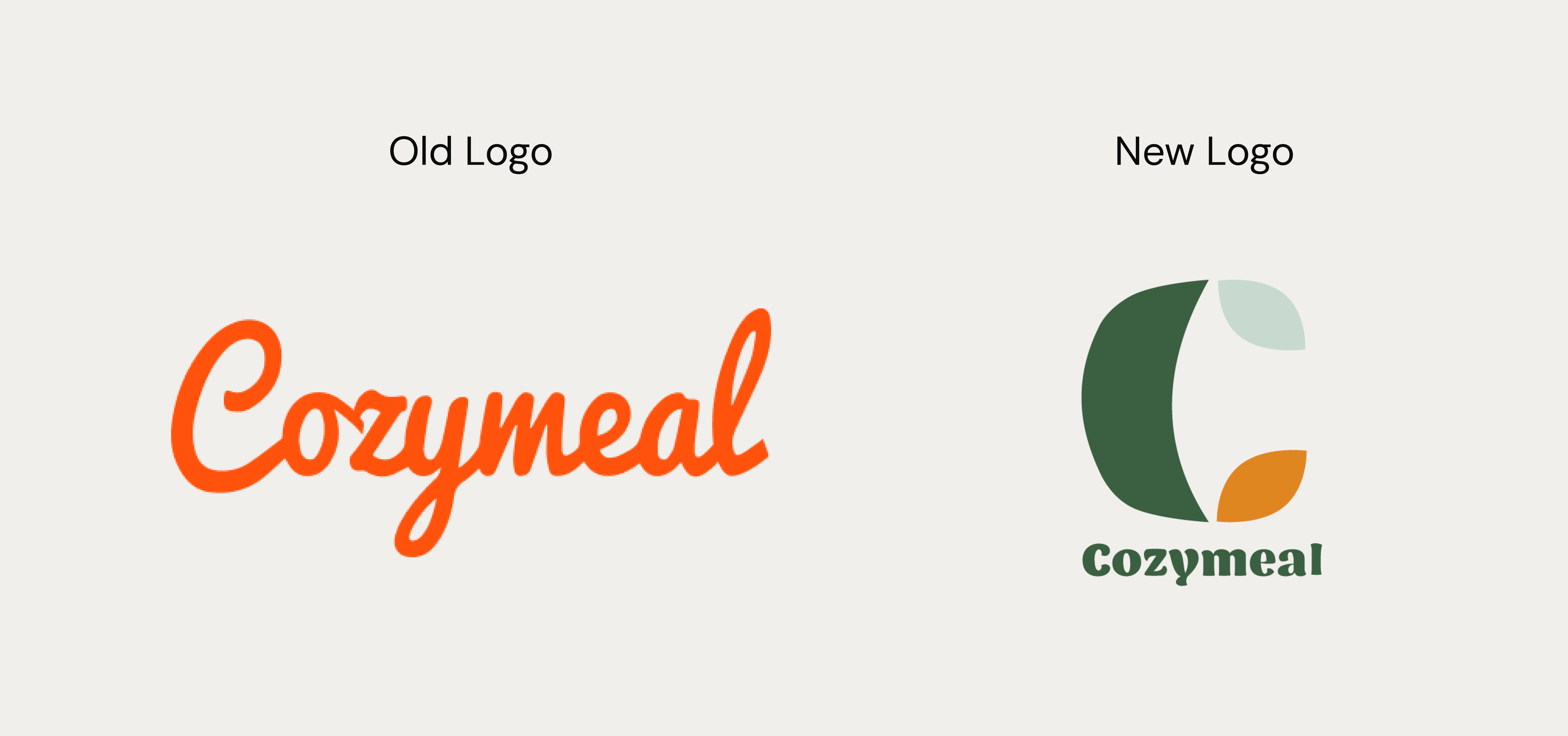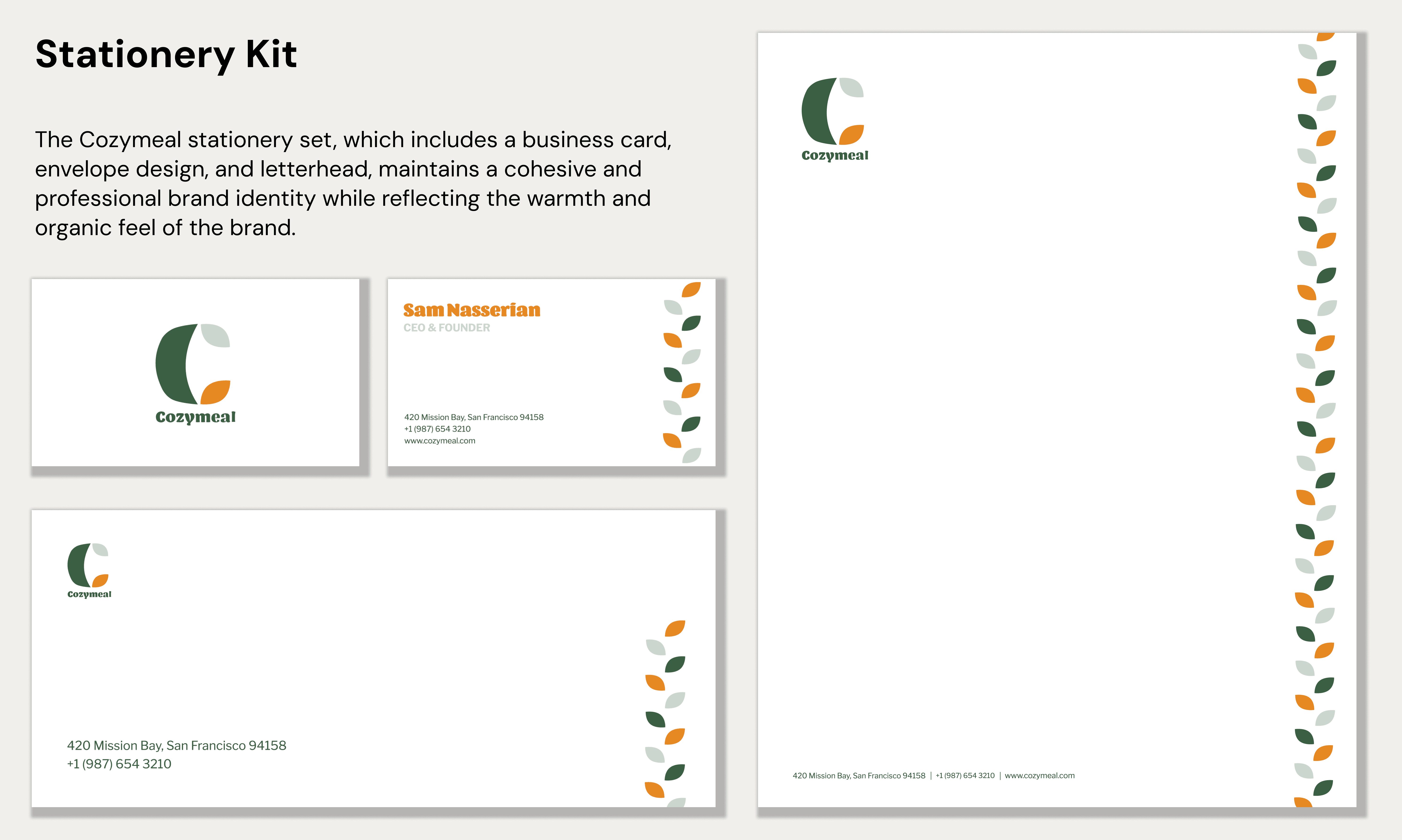 This is a rebranding project for Cozymeal as a class project, featuring a new logo, brand assets, and style guide. The refreshed identity uses earthy greens and warm oranges to convey a professional yet inviting aesthetic, supported by redesigned stationery, social media kits, and a user-friendly website UI.