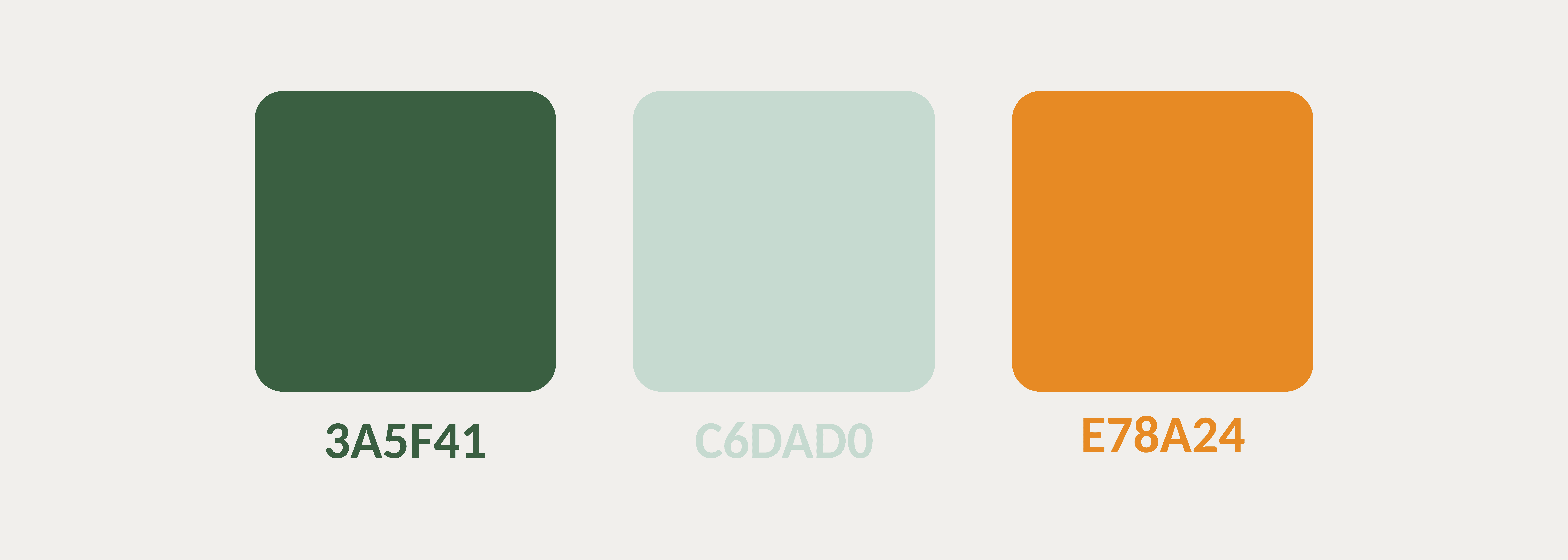 The color palette consists of earthy green tones and a warm orange hue, each chosen with purpose. The deep green (#3A5F41) represents freshness, trust, and sustainability, while the minty green (#C6DAD0) adds a light, airy touch, creating balance. The warm orange (#E78A24) introduces energy, warmth, and a gourmet appeal, making the overall aesthetic both cozy and vibrant.