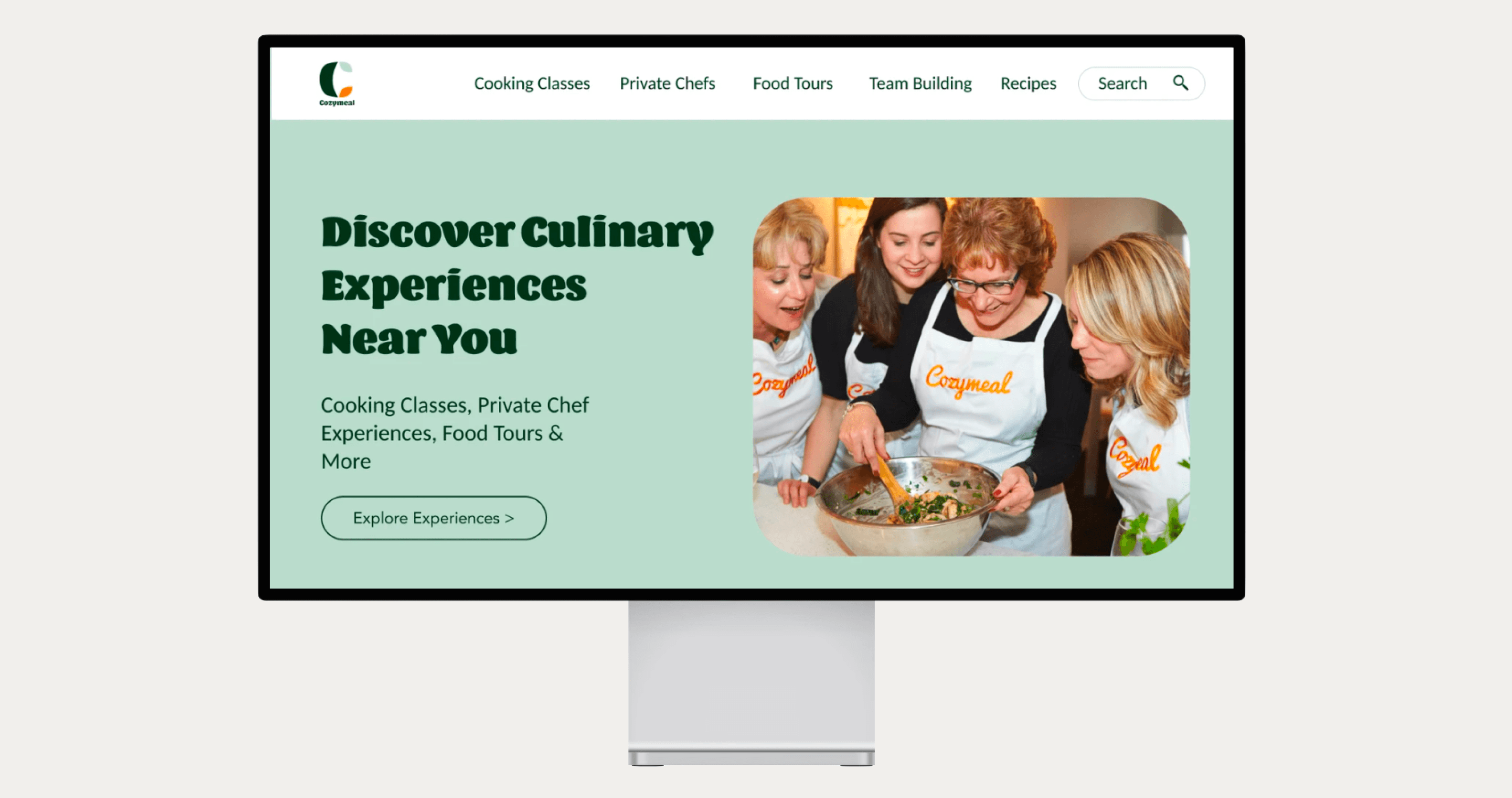 The Cozymeal website redesign was created to enhance the user experience with a modern, clean aesthetic featuring a sophisticated dark green and neutral color palette accented by warm orange CTA buttons.