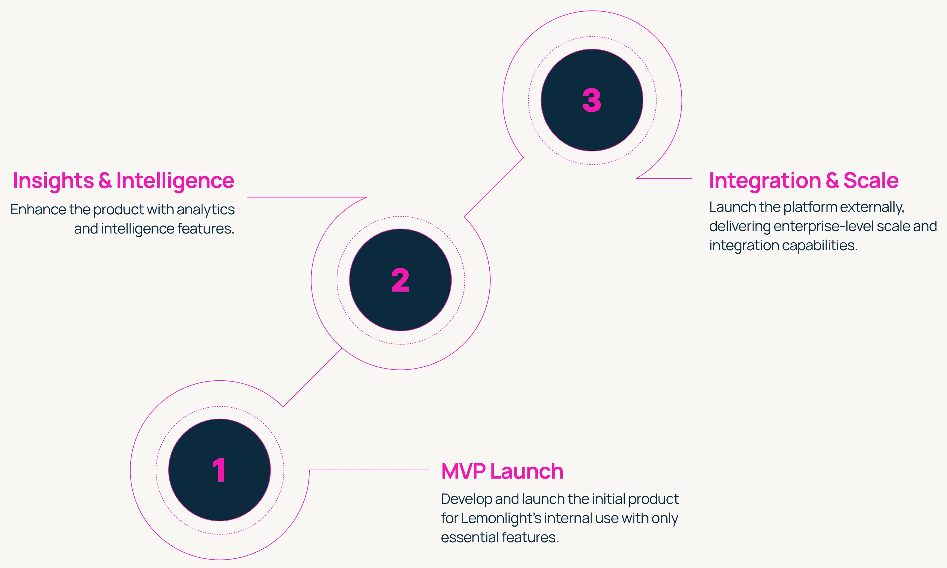 Phase 1: MVP Launch- Focuses on building and releasing the minimum viable product for Lemonlight’s internal teams. The goal is to validate the core idea with only essential features, automated tagging, basic search, and simple edit generation.
